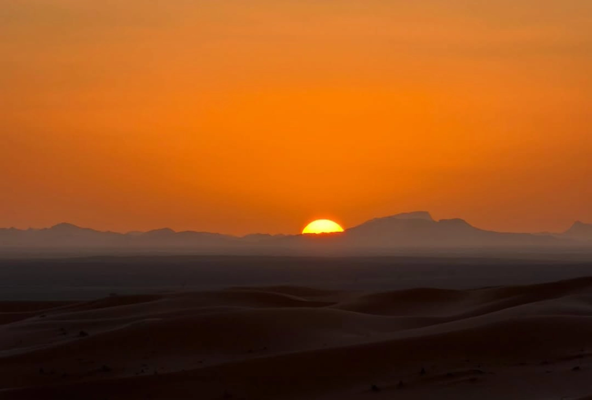 The journey proceeds across mountain passes to a breathtaking panoramic viewpoint overlooking the Ziz Valley, which shelters thousands of palm trees in a valley that truly captivates the heart. Upon arriving in Merzouga by late afternoon, a camel caravan awaits you to begin a trek into the golden Erg Chebbi dunes. We will stop atop the high dunes to witness a magical sunset that paints the sands in warm, vibrant colors. Your first night ends at a well-equipped desert camp, where you will enjoy a delicious traditional dinner under the stars, followed by a musical session with Berber drums around the campfire.