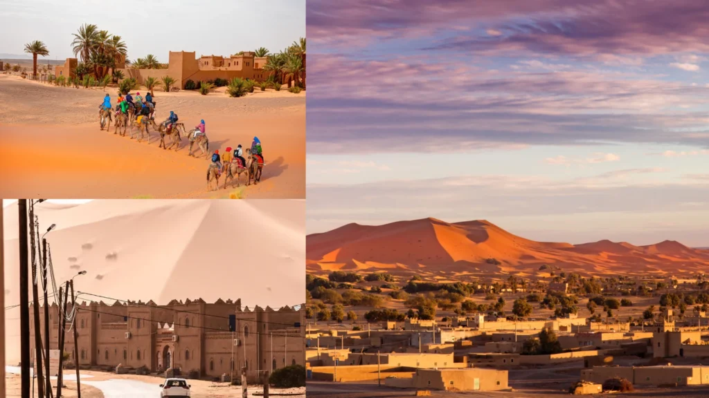 Merzouga is a small village in southeastern Morocco, on the edge of the Erg Chebbi desert, and is considered one of the most visited areas in the world for its stunning beauty. It is about 35 kilometers from Rissani and 50 kilometers from Erfoud, and it is the destination you will reach during the 3-day Marrakech to Fes desert trip. The village is famous for its massive sand dunes, some reaching up to 150 meters high, making them among the tallest in Morocco.